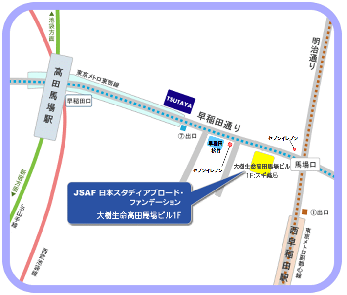 • 東京メトロ東西線/高田馬場駅徒歩3分(7番出口を出て、早稲田通りを右手、早稲田方面に直進。スギ薬局のビル)