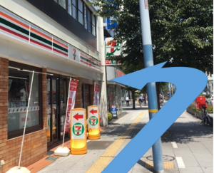 ④「7番出口」から出て、右へ進みます。7番出口へは、西船橋方向ホーム端から上がります。JR、西武高田馬場駅から来ると、地下鉄入口が右側に見えます。