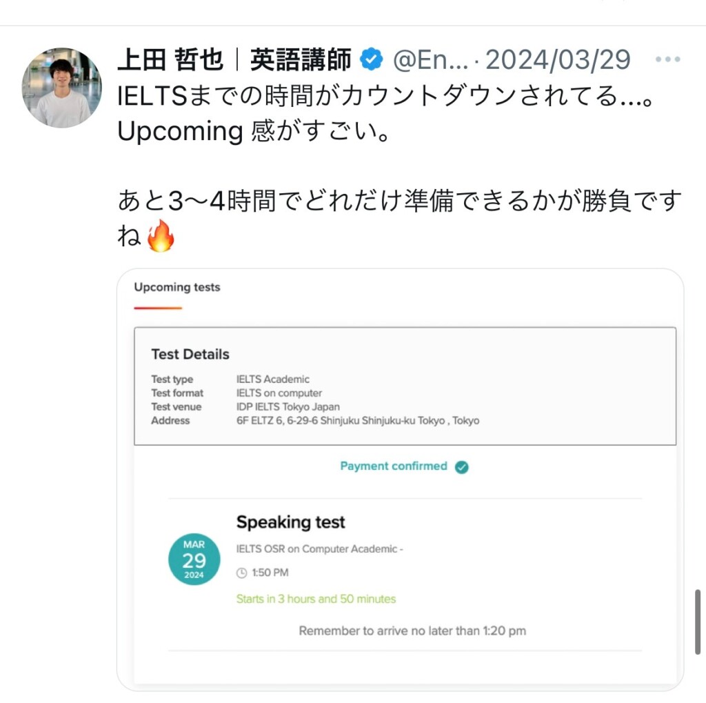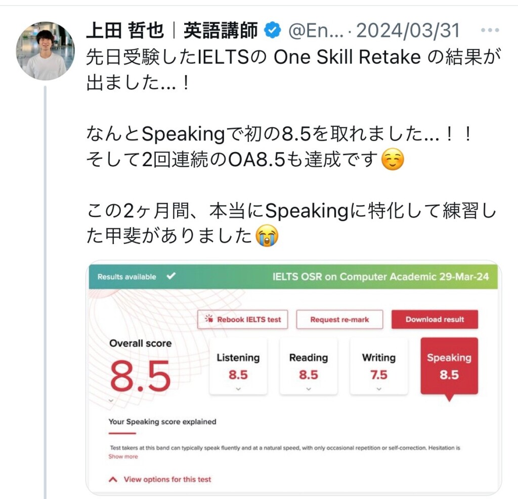 4技能のうち1技能を再受験できるOne Skill Retake。Speakingをリテイクし、自己ベストの8.5を達成した英語コーチの上田哲也先生に受験体験を聞きました!