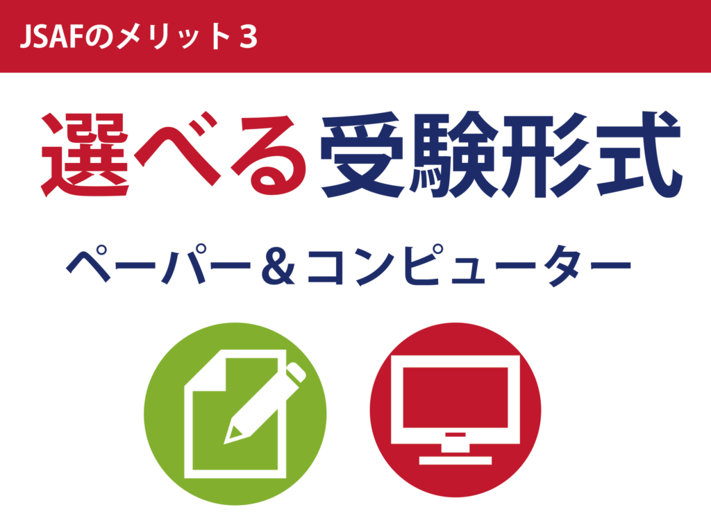 その他、JSAFではテスト開始までの待ち時間を極力減らすなど、受験生の立場にたって、できる限り柔軟性を持って対応することを基本方針としております。