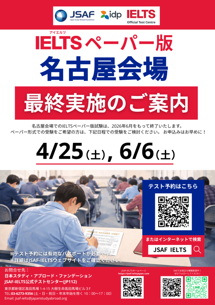 先日ご案内のとおり、IELTSペーパー版試験は終了が予定されております。これに伴い、名古屋会場で実施しているIELTSペーパー版試験も、2026年6月6日(土)をもって最終実施となります。