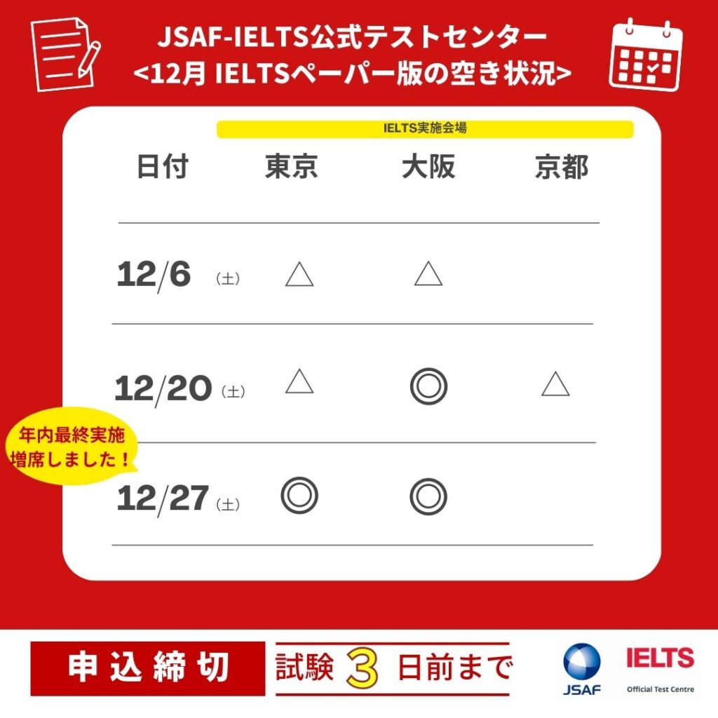12月実施のIELTSペーパー版テスト満席の回が出てきた為増席いたしました!増席分も年末にかけては早期に満席となる傾向がありますので、受験を検討されている方はお早めにお申込下さい😊
