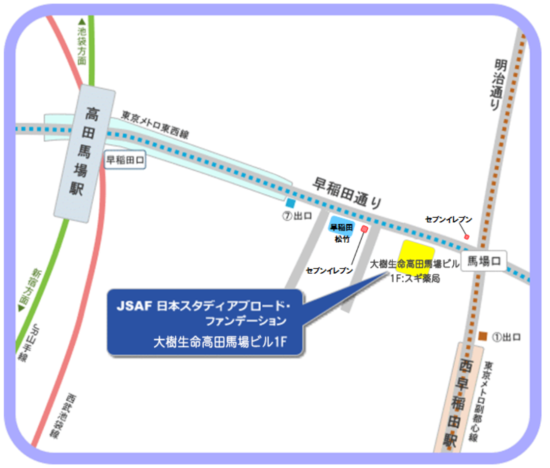 - 東京メトロ東西線/高田馬場駅徒歩3分(7番出口を出て、早稲田通りを右手、早稲田方面に直進。スギ薬局のビル)
