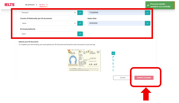 右上に緑色のPersonal details upload successfully!が出たらパスポート画像のアップロード完了です。