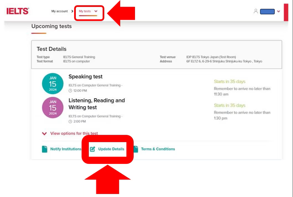 3.My testsをクリックして該当の試験日を確認しUpdate Detailsをクリック